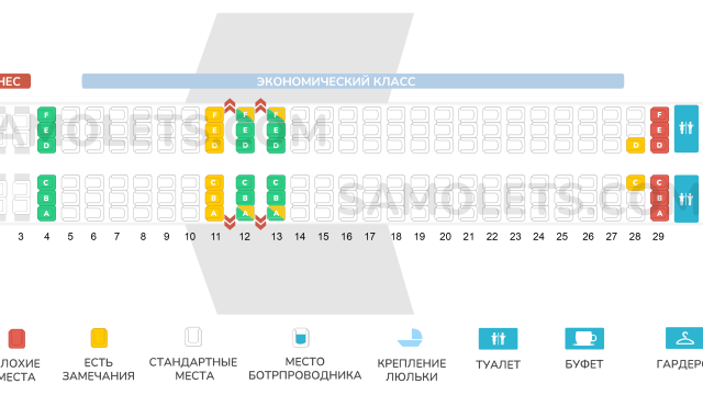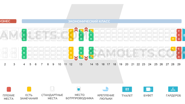 Давайте рассмотрим схему одноклассового салона лайнера (регистрационные номера: RA-73190, RA-73191, RA-73193, RA-73209, RA-73211, RA-73218 (VQ-BPX), RA-73223), чтобы при онлайн регистрации вы легко смогли подобрать удобные места.